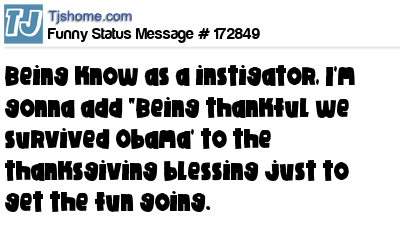 X says Being know as a instigator, I'm gonna add "Being thankful we survived Obama' to the thanksgiving blessing just to get the fun going.