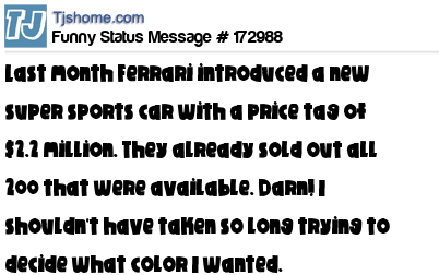 X says Last month Ferrari introduced a new super sports car with a price tag of $2.2 million. They already sold out all 200 that were available. Darn! I shouldn't have taken so long trying to decide what color I wanted.