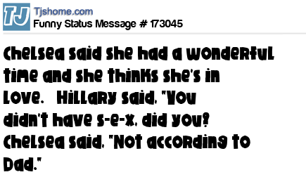 - # 173046 After Chelsea returned from a date, Hillary asked her if she had a good time. Chelsea said she had a wonderful time and she thinks she's in love. Hillary said, "You didn't have sex, did you? Chelsea said, "Not according to Dad."