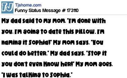 X My dad said to my mom, "I'm done with you, I'm going to date this pillow. I'm naming it Sophia!" My mom says, "You could do better." My dad says, "Stop it you don't even know her!" My mom goes, "I was talking to Sophia."