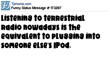 X Listening to terrestrial radio nowadays is the equivalent to plugging into someone else's IPod.