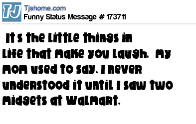 - # 113797 "It's the little things in life that make you laugh," my mom used to say. I never understood it until I saw two midgets fighting at Walmart.