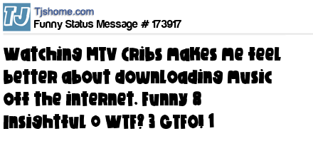 - # 84421 Watching MTV Cribs makes me feel better About downloading music off the internet.
