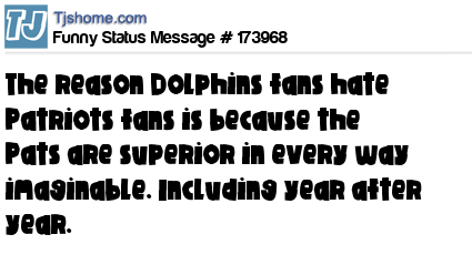 X The reason Dolphins fans hate Patriots fans is because the Pats are superior in every way imaginable. Including year after year.