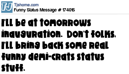 X says I'll be at tomorrows inauguration. Don't folks, I'll bring back some real funny demi-crats status stuff.