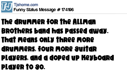 X The drummer for the Allman Brothers band has passed away. That means only three more drummers, four more guitar players, and a doped up keyboard player to go.