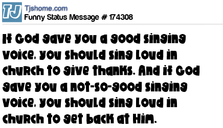 - # 152745 If God gave you a good singing voice you should sing loud in church to give thanks. If God gave you a bad singing voice you should sing loud in church to get even.