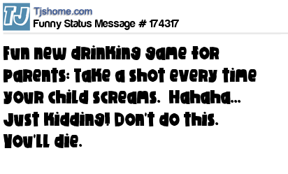 X says Fun new drinking game for parents: Take a shot every time your child screams. Hahaha... Just kidding! Don't do this. You'll die.