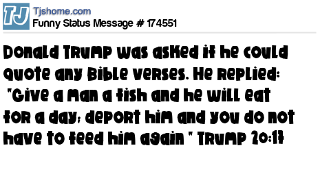 X says Donald Trump was asked if he could quote any Bible verses. He replied: "Give a man a fish and he will eat for a day; deport him and you do not have to feed him again " Trump 20:17
