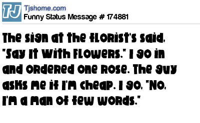 X The sign at the florist's said, "Say It With Flowers." I go in and ordered one rose. The guy asks me if I'm cheap. I go, "No, I'm a man of few words."