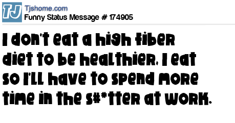 - # 156621 I don't eat a high fiber diet to be healthier, I eat so I'll have to $hit more at work.