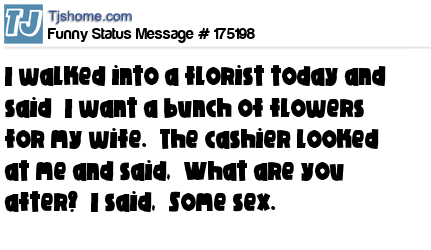 X I walked into a florist today and said “I want a bunch of flowers for my wife.” The cashier looked at me and said, “What are you after?” I said, “Some sex.”