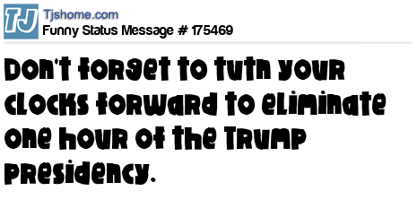 - # 197333 Don't forget to turn your clocks ahead tomorrow so we have one less hour of Trump.