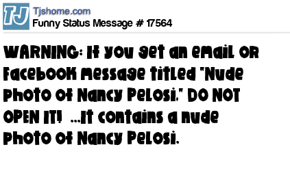 - # 194290 WARNING! If you get an e-mail with the title of "Nude Photo of nancy peelosi" DO NOT OPEN IT! It IS a nude photo of nancy peelosi.