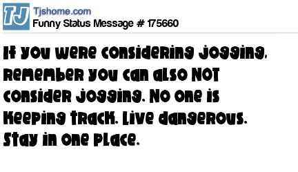 X says If you were considering jogging, remember you can also NOT consider jogging. No one is keeping track. Live dangerous. Stay in one place.