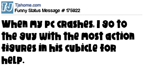 X says When my pc crashes, I go to the guy with the most action figures in his cubicle for help.