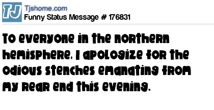 X To everyone in the northern hemisphere, I apologize for the odious stenches emanating from my rear end this evening.