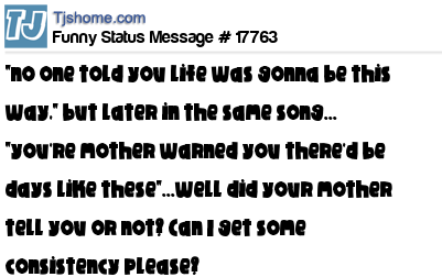 - # 17762 "no one told you life was gonna be this way," but later in the same song... "you're mother warned you there'd be days like these"...well did your mother tell you or not? Can I get some consistency please?