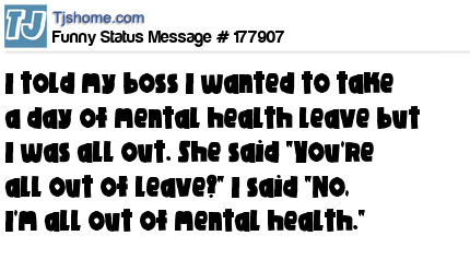 - # 177823 I told my boss I wanted to take some mental health leave but I was all out. He said "You're all out of leave?" I said "No, I'm all out of mental health."