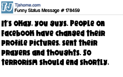 X says It's okay, you guys. People on Facebook have changed their profile pictures, sent their prayers and thoughts. So terrorism should end shortly.