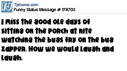 X says I miss the good ole days of sitting on the porch at nite watching the bugs fry on the bug zapper. How we would laugh and laugh.