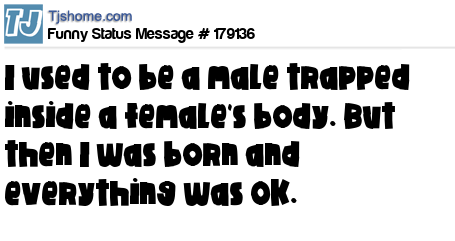 - # 167209 ........ Yup ...... I too was once a male trapped in a female body ...... But then my mother gave birth ......