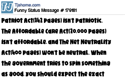 X says Patriot Act(342 pages) isn't patriotic. The Affordable Care Act(20,000 pages) isn't affordable, and The Net Neutrality Act(400 pages) won't be neutral. When the government tries to spin something as good, you should expect the exact opposite.