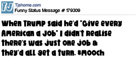 X is When Trump said he'd "Give every American a Job" I didn't realise there's was just one job & they'd all get a turn. #mooch