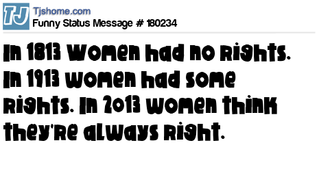 X says In 1813 Women had no rights. In 1913 women had some rights. In 2013 women think they're always right.