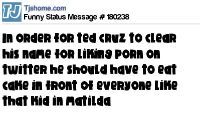 X says in order for ted cruz to clear his name for liking porn on twitter he should have to eat cake in front of everyone like that kid in matilda