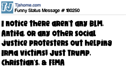 X says I notice there aren't any BLM, Antifa, or any other social justice protesters out helping Irma victims! Just Trump, Christian's, & FEMA