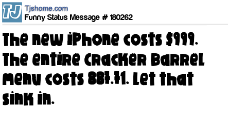 X says The new iPhone costs $999. The entire Cracker Barrel menu costs 887.71. Let that sink in.