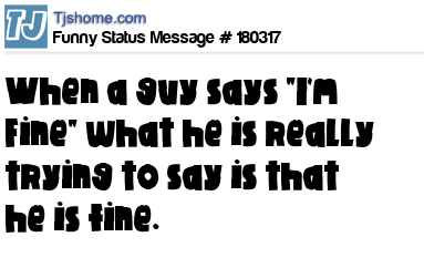 - # 167314 When a man 'fine' he means the battle is over. When a woman says 'fine' she means she is fine with your impending death.