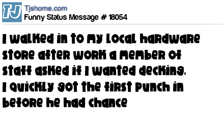 - # 21375 just got barred from Home Depot, some idiot in an orange apron came up to me and asked me if I wanted decking, lucky I got the first punch in!!!!