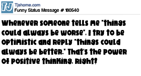 X says Whenever someone tells me "things could always be worse", I try to be optimistic and reply "things could always be better." That's the power of positive thinking, right?