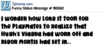 X says I wonder how long it took for the Playmates to realize that Hugh's Viagra had worn off and rigor mortis had set in...