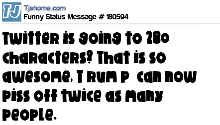 X says Twitter is going to 280 characters? That is so awesome, T rum p can now piss off twice as many people.