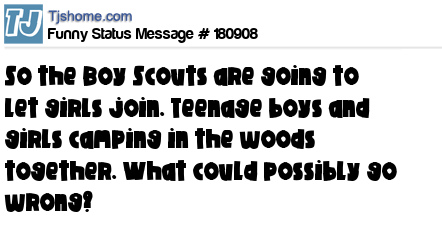 X says So the Boy Scouts are going to let girls join. Teenage boys and girls camping in the woods together. What could possibly go wrong?