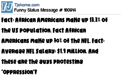X says Fact: African Americans make up 13.3% of the US population. Fact African Americans make up 70% of the NFL. Fact: Average NFL Salary: $1.9 million. And these are the guys protesting "Oppression"?