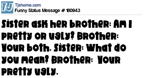 X is Sister ask her brother: Am I pretty or ugly? Brother: Your both. Sister: What do you mean? Brother: Your pretty ugly.