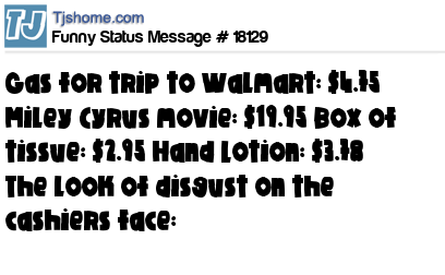 X says Gas for trip to Walmart: $4.75 Miley Cyrus movie: $19.95 Box of tissue: $2.95 Hand Lotion: $3.78 The look of disgust on the cashiers face: