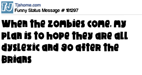 X says When the zombies come, my plan is to hope they are all dyslexic and go after the Brians