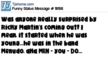 X is was anyone really surprised by Ricky Martin's coming out? I mean, it started when he was young...he was in the band Menudo, aka MEN - you - DO...