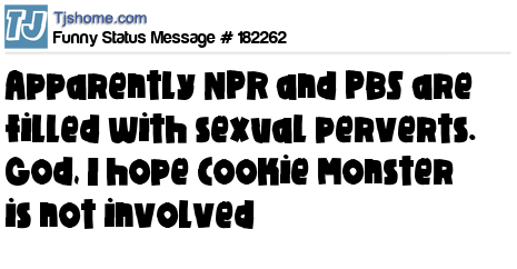 X says Apparently NPR and PBS are filled with sexual perverts. God, I hope Cookie Monster is not involved