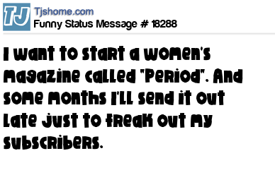 - # 63287 wants to start a women's magazine called "Period". And some months I'll send it out late just to freak out my subscribers.