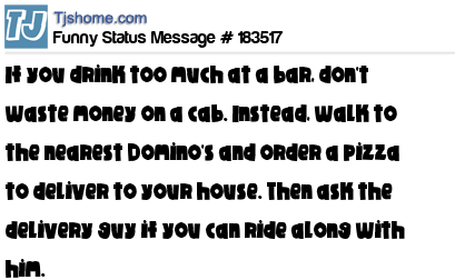 X says If you drink too much at a bar, don't waste money on a cab. Instead, walk to the nearest Domino's and order a pizza to deliver to your house. Then ask the delivery guy if you can ride along with him.