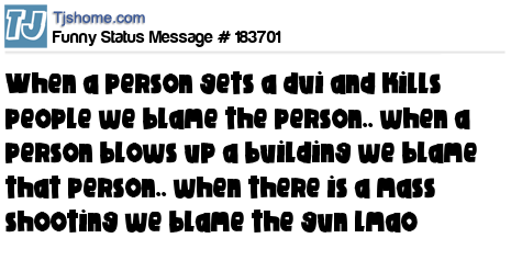 X says When a person gets a dui and kills people we blame the person.. when a person blows up a building we blame that person.. when there is a mass shooting we blame the gun lmao