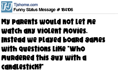 - # 187185 My mom never allowed violent video games. Just family-friendly board games with questions like, "Who murdered this guy with a pipe?"