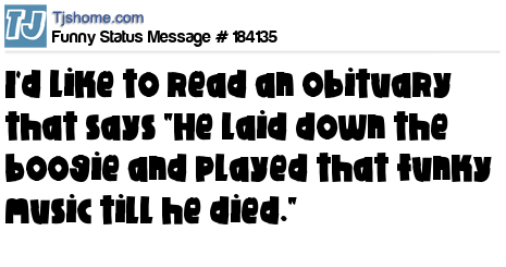 - # 185398 I want my obituary to read: "She laid down the boogie and played that funky music till she died."