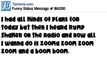 - # 120927 I was planning on being productive today until I heard Rump Shaker on the radio. Now all I wanna do is zoom-a-zoom zoom-zoom in a boom-boom.